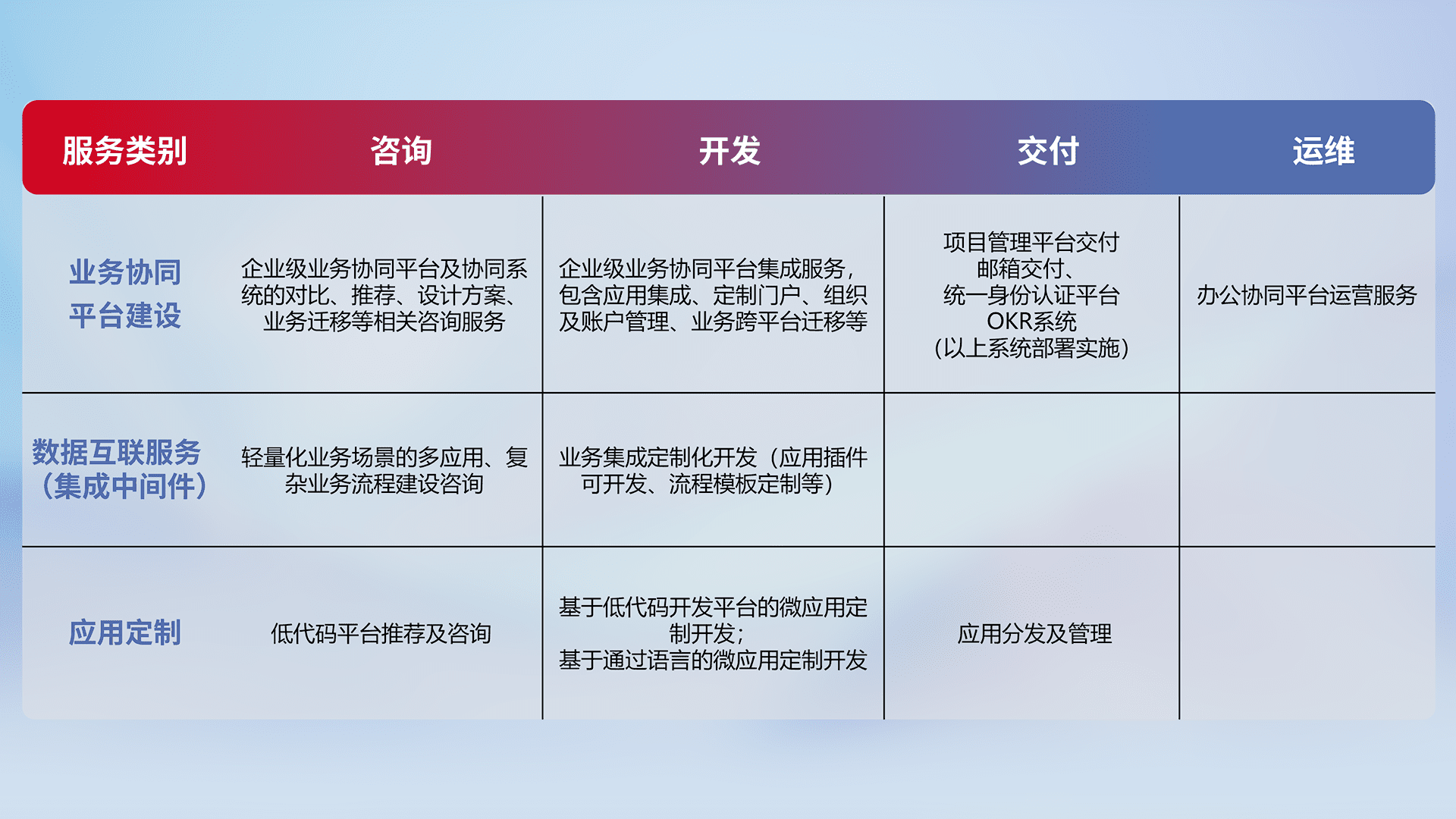 针对钉钉、、、企微、、、、IDaas等平台级产品提供产品的规划、、、方案、、、、交付、、、定制化开发等服务,,,实现如统一协同办公、、、智能客户服务、、混合会议管理、、、智能数据查询、、等业务场景,,,,实现数字化转型。。。