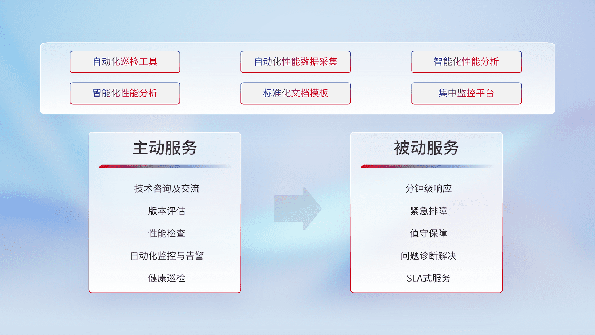 智能化工具和标准化文档,,,,保障服务质量,,,,提供主动服务(包含技术咨询、、、、版本评估、、性能检查、、、自动化监控与告警、、健康巡检)和被动服务包含(分钟级响应、、紧急排障、、、、值守保障、、、、问题诊断解决、、、、SLA服务)。。